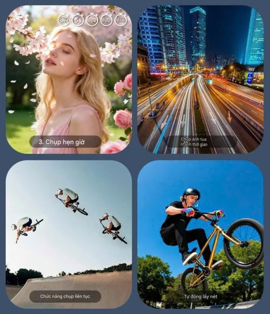 Tự động lấy nét siêu rõ. Chức năng chụp hẹn giờ. Quay video tua nhanh thời gian (TIMELAPSE). Chức năng chụp nhanh liên tục