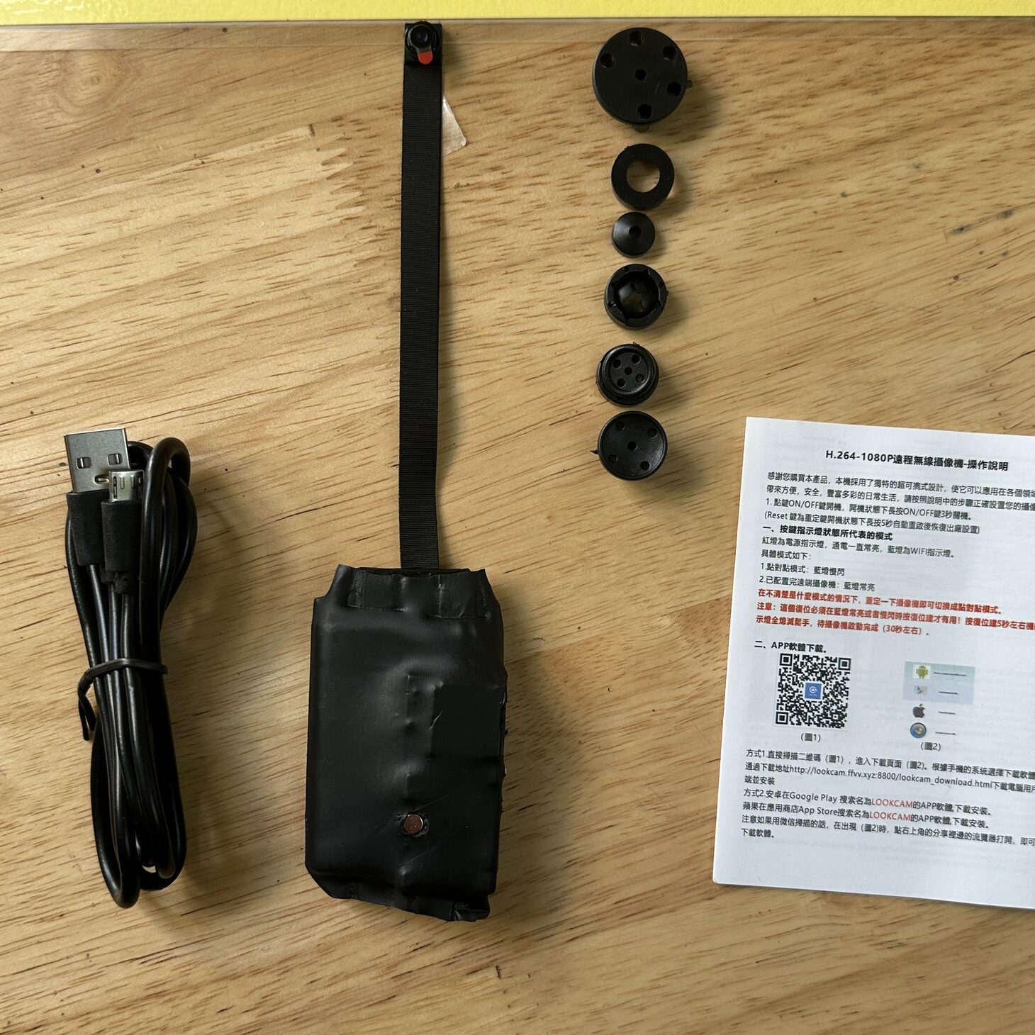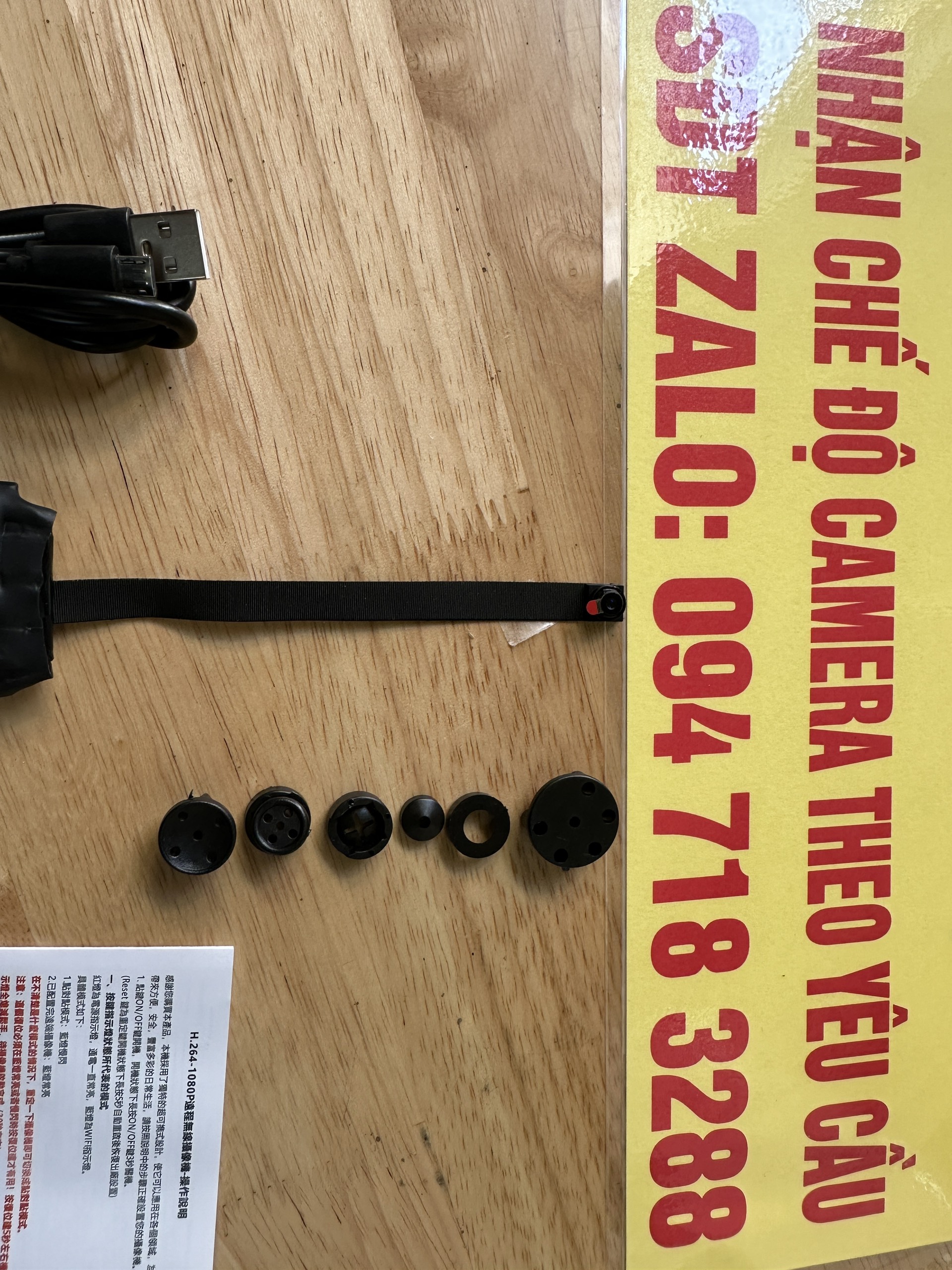 - Bộ Sản phẩm đầy đủ: Camera, Pin, Cáp Sạc, Các cỡ cúc áo ngụy trang, sách hướng dẫn